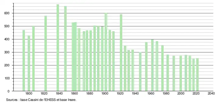 L'évolution du nombre d'habitants est connue à travers les recensements de la population effectués dans la commune depuis 1793. Pour les communes de moins de 10 000 habitants, une enquête de recensement portant sur toute la population est réalisée tous les cinq ans, les populations légales des années intermédiaires étant quant à elles estimées par interpolation ou extrapolation[15]. Pour la commune, le premier recensement exhaustif entrant dans le cadre du nouveau dispositif a été réalisé en 2006[16].