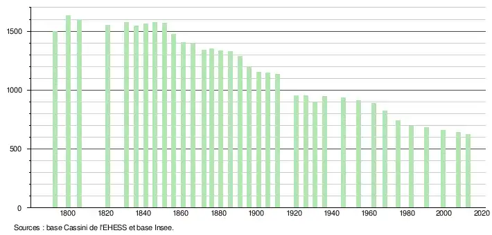- Dans le tableau des recensements et le graphique, par convention dans Wikipédia, le principe a été retenu, pour les populations légales postérieures à 1999 de n’afficher dans le tableau des recensements et le graphique que les populations correspondant à l'année 2006, première population légale publiée calculée conformément aux concepts définis dans le décret no 2003-485 du 5 juin 2003, et les années correspondant à une enquête exhaustive de recensement pour les communes de moins de 10 000 habitants, ainsi que la dernière population légale publiée par l’Insee.