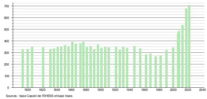 L'évolution du nombre d'habitants est connue à travers les recensements de la population effectués dans la commune depuis 1793. Pour les communes de moins de 10 000 habitants, une enquête de recensement portant sur toute la population est réalisée tous les cinq ans, les populations légales des années intermédiaires étant quant à elles estimées par interpolation ou extrapolation[40]. Pour la commune, le premier recensement exhaustif entrant dans le cadre du nouveau dispositif a été réalisé en 2007[41].