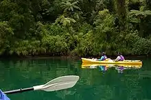 La Nouvelle-Zélande possède d'énormes ressources marines : sa zone économique exclusive est la septième plus grande du monde et recouvre quatre millions de kilomètres carrés, soit plus de quinze fois la taille de sa superficie terrestre[15]. Le pays est parsemé de lacs, particulièrement l'île du Sud, avec notamment le lac Te Anau (344 km2), mais le plus grand est le lac Taupo, dans l'île du Nord, avec 616 km2. L'eau (y compris les rivières, fleuves, lacs et glaciers) recouvre 659 km2[12]. Parmi les cours d'eau les plus importants, on peut citer le Waikato, dans l'île du Nord, plus long fleuve du pays et dans l'île du Sud, le Clarence et le Waimakariri.