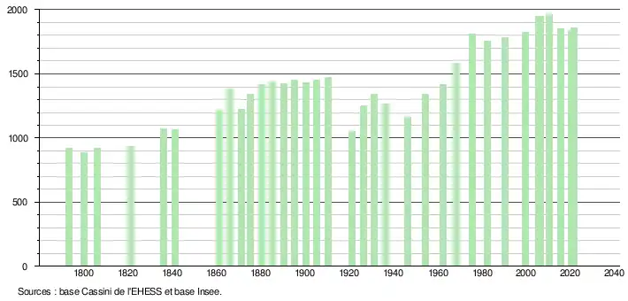 L'évolution du nombre d'habitants est connue à travers les recensements de la population effectués dans la commune depuis 1793. Pour les communes de moins de 10 000 habitants, une enquête de recensement portant sur toute la population est réalisée tous les cinq ans, les populations légales des années intermédiaires étant quant à elles estimées par interpolation ou extrapolation[28]. Pour la commune, le premier recensement exhaustif entrant dans le cadre du nouveau dispositif a été réalisé en 2005[29].