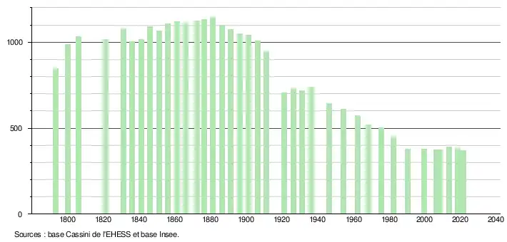 L'évolution du nombre d'habitants est connue à travers les recensements de la population effectués dans la commune depuis 1793. Pour les communes de moins de 10 000 habitants, une enquête de recensement portant sur toute la population est réalisée tous les cinq ans, les populations légales des années intermédiaires étant quant à elles estimées par interpolation ou extrapolation[22]. Pour la commune, le premier recensement exhaustif entrant dans le cadre du nouveau dispositif a été réalisé en 2008[23].