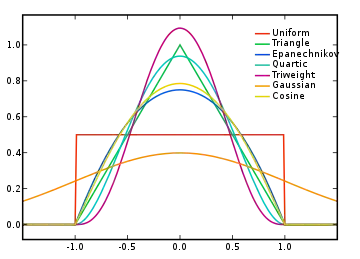 Plusieurs types de noyaux sont couramment utilisés : uniforme, triangle, d'Epanechnikov, quadratique, cubique, gaussien, et circulaire.