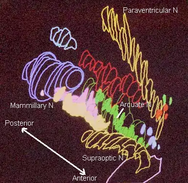 Un troisième groupe de neurones projette hors de l'hypothalamus, dans une large mesure vers des noyaux préautonomiques et des noyaux apparentés du tronc cérébral, ainsi que vers la moelle épinière.