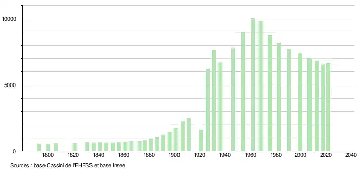 L'évolution du nombre d'habitants est connue à travers les recensements de la population effectués dans la commune depuis 1793. Pour les communes de moins de 10 000 habitants, une enquête de recensement portant sur toute la population est réalisée tous les cinq ans, les populations légales des années intermédiaires étant quant à elles estimées par interpolation ou extrapolation[37]. Pour la commune, le premier recensement exhaustif entrant dans le cadre du nouveau dispositif a été réalisé en 2007[38].