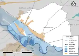 Les crues du Cher sont moins importantes que celles de la Loire, mais elles peuvent générer des dégâts importants. Les crues historiques sont celles de 1856 (5 m à l'échelle de Noyers-sur-Cher), 1940 (4,03 m) et 1977 (3,58 m). Le débit maximal historique est de 1 560 m3/s et caractérise une crue de retour supérieur à cent ans pour Montrichard Val de Cher[49]. Le risque d'inondation est pris en compte dans l'aménagement du territoire de la commune par le biais du Plan de prévention du risque inondation (PPRI) du Cher[50].