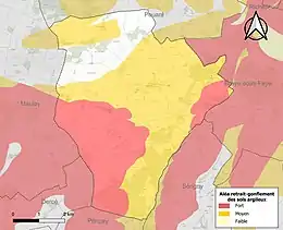 Les mouvements de terrains susceptibles de se produire sur la commune sont des tassements différentiels[18]. Le retrait-gonflement des sols argileux est susceptible d'engendrer des dommages importants aux bâtiments en cas d’alternance de périodes de sécheresse et de pluie[19]. 85,1 % de la superficie communale est en aléa moyen ou fort (79,5 % au niveau départemental et 48,5 % au niveau national)[Carte 2]. Depuis le , en application de la loi ÉLAN, différentes contraintes s'imposent aux vendeurs, maîtres d'ouvrages ou constructeurs de biens situés dans une zone classée en aléa moyen ou fort[Note 2],[20].