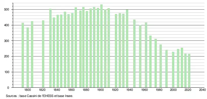 L'évolution du nombre d'habitants est connue à travers les recensements de la population effectués dans la commune depuis 1793. Pour les communes de moins de 10 000 habitants, une enquête de recensement portant sur toute la population est réalisée tous les cinq ans, les populations légales des années intermédiaires étant quant à elles estimées par interpolation ou extrapolation[23]. Pour la commune, le premier recensement exhaustif entrant dans le cadre du nouveau dispositif a été réalisé en 2006[24].
