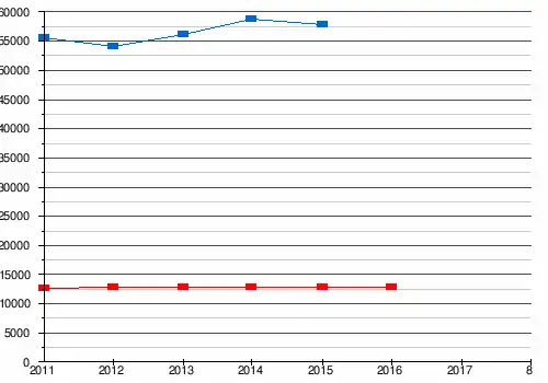 Évolution du numerus clausus annuel des études de santé médicales et pharmaceutiques (rouge) par rapport au nombre de candidats à l'échelle nationale (bleu)