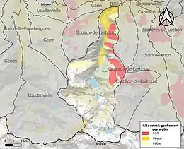 La commune est vulnérable au risque de mouvements de terrains constitué principalement du retrait-gonflement des sols argileux[37]. Cet aléa est susceptible d'engendrer des dommages importants aux bâtiments en cas d’alternance de périodes de sécheresse et de pluie. 16,7 % de la superficie communale est en aléa moyen ou fort (88,8 % au niveau départemental et 48,5 % au niveau national). Sur les 112 bâtiments dénombrés sur la commune en 2019, 107 sont en aléa moyen ou fort, soit 96 %, à comparer aux 98 % au niveau départemental et 54 % au niveau national. Une cartographie de l'exposition du territoire national au retrait gonflement des sols argileux est disponible sur le site du BRGM[38],[Carte 3].