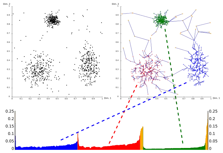 La sortie de l'algorithme permet de construire un diagramme appelé reachability-plot. C'est un diagramme en 2D dont l'axe x correspond à la position d'un point dans la liste ordonnée et l'axe y la reachability-distance associée à ce point. Les points d'un même cluster ont une reachability-distance assez basse, les vallées du diagramme représentent donc les différents clusters du jeu de données. Plus les vallées sont profondes, plus les clusters sont denses. L'image ci-dessus en montre le principe.