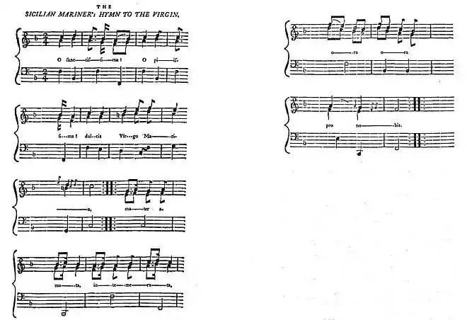 On considérait que les marins de Sicile la chantaient à l'unisson et au soir, mais la tradition ne connaissait que la première strophe, d'après l'article de 1792, qui n'était autre qu'une citation du texte de Charles Burney ayant visité la république de Venise. Le docteur Burney soulignait l'effet de l'unisson par 3 000 voix qui chantaient l'hymne O sanctissima. Selon ce musicologue, tous ceux qui l'exécutaient étaient des marins de Sicile sur leurs bateaux et lors du coucher de soleil ainsi qu'à minuit[9].