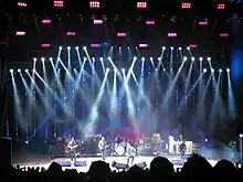 Au printemps , le groupe s'engage aux côtés des Black Crowes pour une tournée américaine et canadienne intitulée Brotherly Love Tour[147]. Les critiques musicaux et la presse américaine sont alors dubitatifs à propos d'Oasis, et prévoient déjà certains problèmes entre les frères Gallagher : « Si vous avez déjà rêvé de ce qu'aurait pu être un double programme Rolling Stones-Beatles, voici le pire des scénarios. En Amérique, les frères Gallagher sont considérés comme un succès sans lendemain, une copie des Beatles à l'accent mancunien impénétrable et à l'attitude scénique figée, impatients de se faire remarquer » [sic] écrit Duncan Campbell du Guardian[148]. Cependant, la tournée se passe bien et se termine le , après 19 concerts[149]. De retour en Europe, Oasis participe à un concert supplémentaire au Palais omnisports de Paris-Bercy avec le musicien canadien Neil Young[150].
