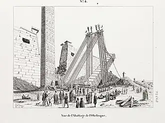 L'obélisque est érigé en grande pompe, le , par l'ingénieur Apollinaire Lebas[15] à l'aide de machines élévatrices et de gigantesques cabestans. L’orientation originelle du monolithe par rapport aux points cardinaux n'a pas été respectée ; elle a subi une rotation anti-horaire d'environ 90°[alpha 1]. La face originellement à l’est s’est donc retrouvée au nord[16]. L’obélisque est dit « décalé » comme l'exprime le texte métaphorique d'un médaillon scellé au sol en 1939 : « Au levant de Thèbes surgit à Paris le Nord. »