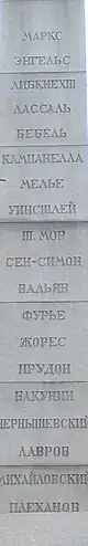 À la suite de la Révolution d'Octobre, le nouveau régime entreprend de détruire les monuments à la gloire des anciens monarques et de les remplacer par des monuments glorifiant la révolution et ses acteurs. Cependant, l'obélisque n'est pas détruit mais transformé en 1918 par l’architecte Nikolaï Vsevolojski et les éléments rappelant l'ancien régime sont enlevés. Les armoiries de la base du monument sont arasées et le cartouche central reçoit l'inscription « Р. С. Ф. С. Р. », abréviation de « Российская Советская Федеративная Социалистическая Республика », en français, RSFSR, République socialiste fédérative soviétique de Russie. En remplacement du nom des tsars, une liste de 19 noms, approuvés par Lénine, est gravée. Il s'agit de penseurs considérés comme des précurseurs de l'idéologie socialiste, cinq sont russes, les autres de divers pays (six Français, cinq Allemands, deux Anglais et un Italien), l'ordre n'est pas chronologique et tous sont morts avant l'établissement de la liste.