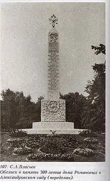 Le monument, sous la forme d'un obélisque en granit de Finlande, est construit en 1914 pour commémorer le tricentenaire de la dynastie des Romanov (en 1913). Il est alors décoré de bas-relief représentant saint Georges, les armoiries des provinces russes et est couronné par l'aigle bicéphale impérial. Y sont inscrits les noms des tsars de la dynastie Romanov de Michel Ier de Russie à Nicolas II.