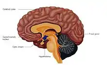 L'hypothalamus est une glande du cerveau utilisent des hormones et le système nerveux autonome pour permettre l’équilibration des flux d'énergie dans le corps. Les neurones de l'hypothalamus ont la capacité de se différencier, y compris l'horloge biologique. Cette horloge a une organisation distincte en fonction du compartiment du corps qu'elle commande. Par la suite il a été prouvé que le tissu adipeux peut provoquer une rétroaction neuronale qui peut atteindre le tronc cérébral. Des chercheurs ont pu proposer que cette organisation spécifique en fonction du compartiment corporel que commande l’horloge circadienne offre une nouvelle perspective neuroanatomique pour le dysfonctionnement des organes impliqué dans le diabète de type 2[20].