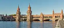 L’Oberbaumbrücke est un pont traversant la Sprée à Berlin, construit dans le style néogothique de brique sur deux étages entre 1894 et 1896. Il relie les quartiers de Friedrichshain et Kreuzberg, d'anciens arrondissements de la ville qui ont été séparés par le mur de Berlin jusqu'en 1989. Pour cela, il est devenu un important symbole de l'unité de la ville.