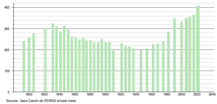 L'évolution du nombre d'habitants est connue à travers les recensements de la population effectués dans la commune depuis 1793. Pour les communes de moins de 10 000 habitants, une enquête de recensement portant sur toute la population est réalisée tous les cinq ans, les populations légales des années intermédiaires étant quant à elles estimées par interpolation ou extrapolation[27]. Pour la commune, le premier recensement exhaustif entrant dans le cadre du nouveau dispositif a été réalisé en 2005[28].