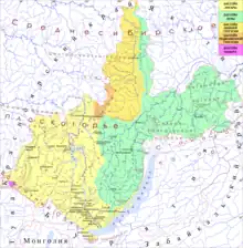 Au XIIIe siècle, la région du lac Baïkal passe sous l'influence mongole. Gengis Khan conquiert les Merkits[32] et les Tatars qui étaient installés dans la région avant 1227, en route de sa conquête de l'Asie centrale. Ses descendants continuent la conquête de l'Asie. Kubilaï Khan, après avoir conquis l'ensemble du territoire chinois à la dynastie Song, puis ses dernières résistances au Sud du Changjiang, dans ce que l'on appelle la dynastie Song du Sud, crée la dynastie Yuan contrôlée de Khanbalik (aujourd'hui Pékin) en 1270. Les Mongols sont remplacés par la dynastie Ming sur une grande partie du territoire chinois et voient leur territoires limités aux steppes mongoles et plus au nord, dans ce que l'on appelle la Dynastie Yuan du Nord au XIVe siècle.