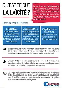 Le , l'Observatoire de la laïcité publie deux guides pratiques, l’un à destination des élus locaux et des agents publics, l’autre à destination des professionnels du secteur privé. Il s'agit d'apporter des réponses concrètes, encadrées par le droit, aux difficultés pratiques[57],[58].