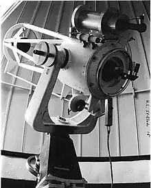 La monture équatoriale du télescope est du type " monture à fourche ". L'instrument comporte, en plus de l'entraînement électrique conventionnel de l'axe horaire, une possibilité de correction électrique sur chacun des deux axes. Le télescope est boulonné sur une colonne de béton armé de 91 centimètres de diamètre entièrement isolée de l'édifice. Cette colonne a fait l'objet de calculs particuliers. Elle est évidée et permet une aération forcée des divers étages vers le bas de l'édifice. (Source: Département de Physique, Université Laval).