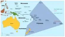 Les îles polynésiennes sont dispersées dans un triangle couvrant la région centre-est de l’océan Pacifique. Le triangle est délimité par les îles Hawaï au nord, la Nouvelle-Zélande à l'ouest et l'île de Pâques à l'est. Le reste de la Polynésie comprend les îles Samoa (Samoa américaines et Samoa (anciennement Samoa occidentales) ; les Îles Cook ; la Polynésie française (l'archipel de la Société à Tahiti, les îles Marquises, les îles Australes et les Tuamotu) ; l'île de Niue ; Tokelau et Tuvalu ; Tonga ; Wallis-et-Futuna ; Rotuma ; l'île Pitcairn ; Nukuoro ; et Kapingamarangi[48].