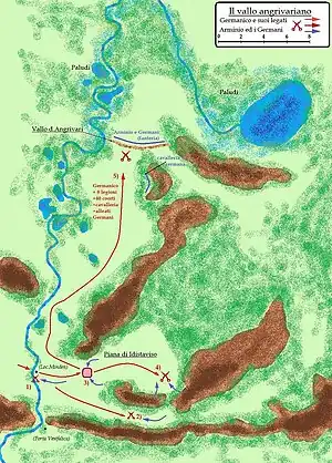 Avec une manœuvre « en tenaille », Caius Sentius Saturninus devait partir de Moguntiacum (ou du camp de légionnaires de Marktbreit, le long du Main), avec 2 ou 3 légions (sans doute les légions XVII, XVIII et XIX ou XVI Gallica) qui devaient rejoindre l'armée de Rhétie (constituée probablement de la I Germanica et de la V Alaudae).