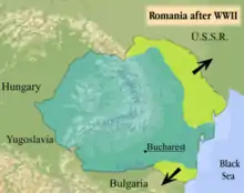 La deuxième offensive soviétique Jassy-Kishinev conduit à la défaite de la Roumanie, au coup d'État royal qui suit et au changement de camp de la Roumanie, qui passe de l'Axe aux Alliés. Les troupes soviétiques sont stationnées dans ce pays de 1944 à 1958[37]. Le 12 septembre 1944, alors que l'Armée rouge contrôle déjà une grande partie du territoire roumain, un accord d'armistice entre la Roumanie et l'URSS est signé, en vertu duquel la Roumanie rétrocéda le territoire qu'elle administrait plus tôt dans la guerre et se soumit à une commission alliée composée du Union soviétique, États-Unis et Royaume-Uni. Sur le terrain, c'est le commandement militaire soviétique, et non les alliés occidentaux, qui exerce de facto l'autorité dominante. La présence et la libre circulation des troupes soviétiques sont explicitement stipulées dans l'accord[38].