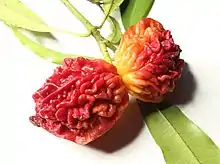 Les fruits ont la peau bosselée, avec deux méricarpes, et sont de couleur rouge grenat à noir à maturité. Ils sont plats et ressemblent un peu aux pruneaux, mesurant environ 5 cm de long[2].