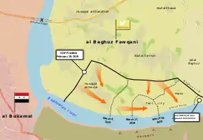 Le 14 septembre, au moins 20 combattants des FDS sont tués dans une embuscade tendue par les djihadistes pendant une tempête de sable[108]. Le 20 septembre, les FDS s'emparent d'al-Baghouz Fouqani et du pont détruit menant à Boukamal[5]. Le 25 septembre, elles prennent ensuite al-Shajalah, au nord d'al-Baghouz Fouqani[5]. Le 1er octobre, l'EI lance une contre-attaque au village de Mozan, au Nord d'al-Shajalah[5].