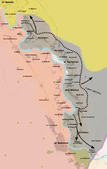 Le 15 novembre, les FDS avancent d'une quinzaine de kilomètres près de la frontière irakienne et arrivent à moins de 20 kilomètres au nord de Boukamal[52]. Le 25 novembre, elles progressent à travers le désert depuis le champ pétrolier de Kashmeh et atteignent la frontière irakienne au nord-est de Boukamal[53].