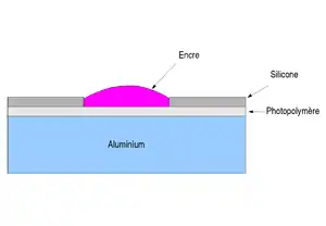 La plaque offset est ensuite calée sur le cylindre porte-plaque de la presse offset, dans laquelle elle va être successivement humidifiée par une solution de mouillage, puis encrée avec de l'encre grasse : la couche hydrophile (donc lipophobe) accepte l'eau et repousse l'encre grasse tandis que la couche lipophile (donc hydrophobe) accepte l'encre grasse et repousse l'eau.