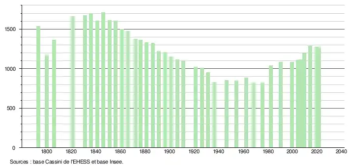 L'évolution du nombre d'habitants est connue à travers les recensements de la population effectués dans la commune depuis 1793. Pour les communes de moins de 10 000 habitants, une enquête de recensement portant sur toute la population est réalisée tous les cinq ans, les populations légales des années intermédiaires étant quant à elles estimées par interpolation ou extrapolation[54]. Pour la commune, le premier recensement exhaustif entrant dans le cadre du nouveau dispositif a été réalisé en 2004[55].