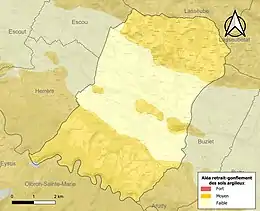 Le retrait-gonflement des sols argileux est susceptible d'engendrer des dommages importants aux bâtiments en cas d’alternance de périodes de sécheresse et de pluie[43]. 58,1 % de la superficie communale est en aléa moyen ou fort (59 % au niveau départemental et 48,5 % au niveau national)[Carte 6]. Depuis le , en application de la loi ELAN, différentes contraintes s'imposent aux vendeurs, maîtres d'ouvrages ou constructeurs de biens situés dans une zone classée en aléa moyen ou fort[Note 9],[44].