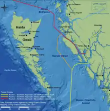 Depuis 1972, un moratoire de fait est en vigueur sur le trafic des superpétroliers venant d'Alaska dans l’entrée Dixon, le détroit d'Hecate et le détroit de la Reine-Charlotte[60]. Depuis cette date, les gouvernements fédéral et provincial ont commandé périodiquement des études pour déterminer si ce moratoire devait être levé. Chacune de ces études a conclu que le risque de fuite est trop élevé. En 2003-2004, le gouvernement a entamé un processus de révision tripartite, comprenant une étude scientifique de la Société royale du Canada (SRC)[61], une consultation des Premières nations concernées[62] et un processus de consultations publiques[63]. Le rapport de la SRC a conclu que les restrictions actuelles sur le trafic pétrolier le long de la côte ouest de la Colombie-Britannique devraient être maintenues.