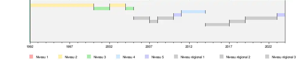 La frise chronologique suivante montre l'évolution des championnats de la Fédération française de football et de la Ligue de football professionnel auxquels l'Olympique de Valence a participé au cours de son histoire. Les noms des championnats et le nombre de niveaux ont évolué au cours des années. Pour les championnats nationaux, se reporter à l'article football en France, pour les championnats régionaux, à l'article Ligue Auvergne-Rhône-Alpes de football.