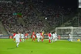 Après 1976, un changement radical est opéré sur la tunique du club lyonnais. La couleur blanche est remplacée par un ensemble maillot et short entièrement rouge et dépourvu de blason[137] pendant les deux saisons entre 1976 et 1978 puis ce rouge est complété de plusieurs bandes verticales bleues les deux saisons suivantes. Le maillot rouge uni est de nouveau remis en place à partir de 1980[138] et jusqu'en 1990 avec quelques variantes, notamment en 1985 où le haut du maillot et les manches ont une couleur blanche puis en 1989 avec une bande de couleur bleue en forme de « V » sur la partie haute du maillot.