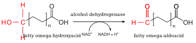 Hydroxylation : le carbone ω est hydroxylé par une monooxygénase fonctionnant avec le cytochrome P450 et un cofacteur NADPH. Ces réactions sont catalysées par des oxydases à fonction mixte : |