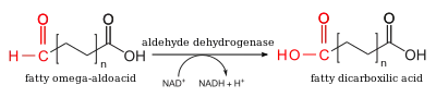 L'acide dicarboxylique formé peut être activé en formant une liaison thioester avec une coenzyme A et migrer dans les mitochondries pour être métabolisé par β-oxydation et donner des acides dicarboxyliques plus courts, typiquement l'acide succinique en C4 et l'acide adipique en C6.