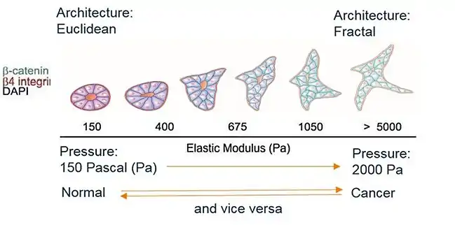 Cette différence – le tissu cancéreux est plus mou que sa contrepartie normale – traverse toute la cancérologie, tous cancers confondus et depuis la cellule dysplasique jusqu’aux cellules tumorales et métastasiques[16],[17],[18],[19],[20].