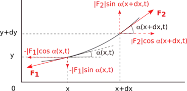 Aux extrémités du segment, on a les forces de tension et de norme (module) T et de sens opposés qui s'exercent tangentiellement à la corde. Le poids, suivant l'axe y, est considéré comme négligeable par rapport aux forces de tension.