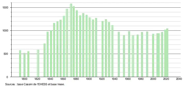 | L'évolution du nombre d'habitants est connue à travers les recensements de la population effectués dans la commune depuis 1793. Pour les communes de moins de 10 000 habitants, une enquête de recensement portant sur toute la population est réalisée tous les cinq ans, les populations légales des années intermédiaires étant quant à elles estimées par interpolation ou extrapolation[23]. Pour la commune, le premier recensement exhaustif entrant dans le cadre du nouveau dispositif a été réalisé en 2008[24]. En 2021, la commune comptait 1 045 habitants[Note 2], en augmentation de 5,98 % par rapport à 2015 (Landes : +4,9 %, France hors Mayotte : +1,84 %). |