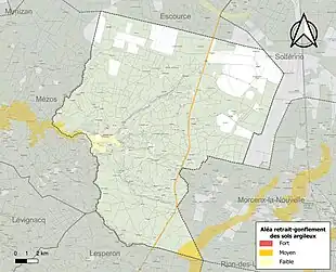 Le retrait-gonflement des sols argileux est susceptible d'engendrer des dommages importants aux bâtiments en cas d’alternance de périodes de sécheresse et de pluie. 1,2 % de la superficie communale est en aléa moyen ou fort (19,2 % au niveau départemental et 48,5 % au niveau national). Sur les 594 bâtiments dénombrés sur la commune en 2019, 2 sont en aléa moyen ou fort, soit 0 %, à comparer aux 17 % au niveau départemental et 54 % au niveau national. Une cartographie de l'exposition du territoire national au retrait gonflement des sols argileux est disponible sur le site du BRGM[20],[Carte 2].