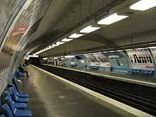 Depuis les années 1950 jusqu'aux années 1980, les piédroits de la ligne 3 sont revêtus d'un carrossage métallique avant leur rénovation en style « Andreu-Motte ». Les quais des lignes 7 et 8 ont quant à eux été modernisés du début des années 1970 jusqu'à 2007 dans un style unique avec trois tons de bleus (un ton foncé pour les sièges de style « Motte » et la voûte, et deux autres tons plus clairs pour les petits carreaux des piédroits)[1]. Le nom de la station était constitué de larges lettres capitales blanches en relief[1]. Cette décoration, dérivée du style « Mouton-Duvernet » dont elle reprenait notamment le bandeau d'éclairage caractéristique, était parfois surnommée « piscine ». Le plafond bleu a par la suite été repeint en blanc afin d'accroître la luminosité. L'intégralité de l'aménagement a été retiré en 2007 à l'occasion de la rénovation de la station dans le cadre du programme « Renouveau du métro » de la RATP[2]. Seule la station Saint-Lazare des lignes 12 et 13 a possédé une décoration comparable jusqu'au milieu des années 2000.