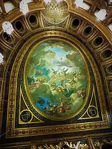 Louis-Jacques Durameau a peint le plafond central, où il a représenté Apollon distribuant des couronnes aux Muses, et les douze petits plafonds de la colonnade où il a évoqué les amours des dieux. Leurs coloris délicats s’harmonisent avec le décor en faux marbre de la salle, où dominent le vert Campan et le sérancolin.