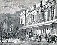 - 1858. Devant l'entrée de l'opéra où ils se rendent en calèche, le , l'empereur Napoléon III et l'impératrice Eugénie subissent l'attentat d'Orsini. Les bombes que cet indépendantiste italien et ses deux complices lancent sur le cortège font de nombreuses victimes et des dégâts importants, mais le couple impérial s'en sort indemne et peut se montrer à sa loge (voir le récit détaillé). Le spectacle continue selon le programme prévu[7], composé pour honorer le baryton Eugène Massol qui prend sa retraite : fragments du deuxième acte de Guillaume Tell de Rossini ; dernier acte de Marie Stuart, tragédie en cinq actes de Schiller[note 3] ; extraits du ballet Gustave III ou le Bal masqué d'Auber (pas « chinois », pas « nouveau », pas « du Cheval de bronze »). C'est deux jours après l'attentat que Wagner arrive à Paris ; c'est son sixième séjour en France, au cours duquel il rend visite à Hector Berlioz, qui lui lit le poème des Troyens