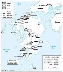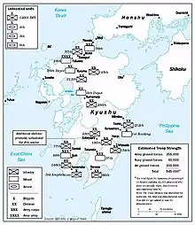 En mars 1945, Kyūshū n'était défendue que par une seule division. Au cours des quatre mois suivants, l'Armée impériale transféra des forces depuis la Manchourie, la Corée, et le nord du Japon tout en recrutant de nouvelles forces sur place. Vers le mois d'août, quatorze divisions et quelques autres formations moins nombreuses, y compris onze brigades dont trois blindées soit un total de 900 000 hommes, étaient présentes sur l'île[21]. Bien que les Japonais aient été capables de recruter de nombreux soldats, les équiper était autre chose. En août, l'Armée japonaise disposait de l'équivalent de 65 divisions sur son sol mais n'avait de quoi en équiper que 40, et de munitions que pour 30 jours seulement[22].