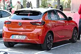 L'Opel Corsa-e est la version 100 % électrique de la Corsa F, basée sur ses cousines DS 3 Crossback E-Tense et Peugeot e-208[8]. Elle est produite en Espagne à l’usine de Figueruelas située près de Saragosse, à partir du début de l’année 2020. Elle est disponible à la commande pour un prix inférieur à celui de la Peugeot e-208[9].