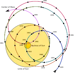 Le Soleil étant de très loin le corps le plus massif du Système solaire (700 fois plus massif que l'ensemble du reste du Système solaire), le barycentre du Système solaire est situé dans le Soleil ou à proximité de celui-ci. La distance entre le barycentre du Soleil et le barycentre du Système solaire varie en fonction de la position des autres corps du système planétaire, notamment des quatre planètes géantes gazeuses dont Jupiter, la plus massive.